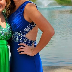 Since prom season is right around the corner... This dress had only been worn once! Was only worn for pictures-wasn't able to attend last minute for certain reasons, so the dress is as good as new! The dress is a great material-not cheap- paid for what it is worth! Has bedazzles and sequins on the trim on the back, doesn't itch or feel uncomfortable, very soft, breathable.