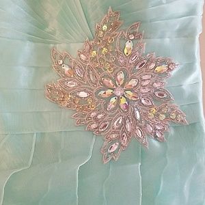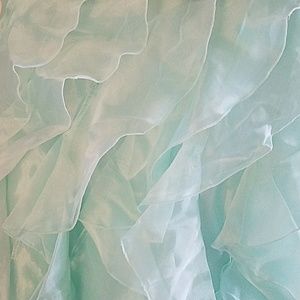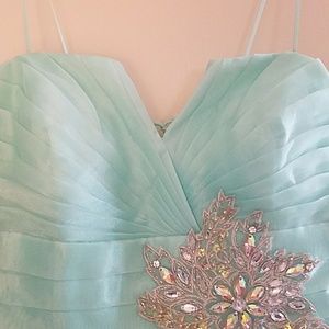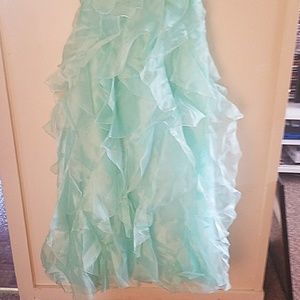 Seafoam blue prom dress. Worn for 1 hour. Never hemmed, no stains or tears. Very light fabric!