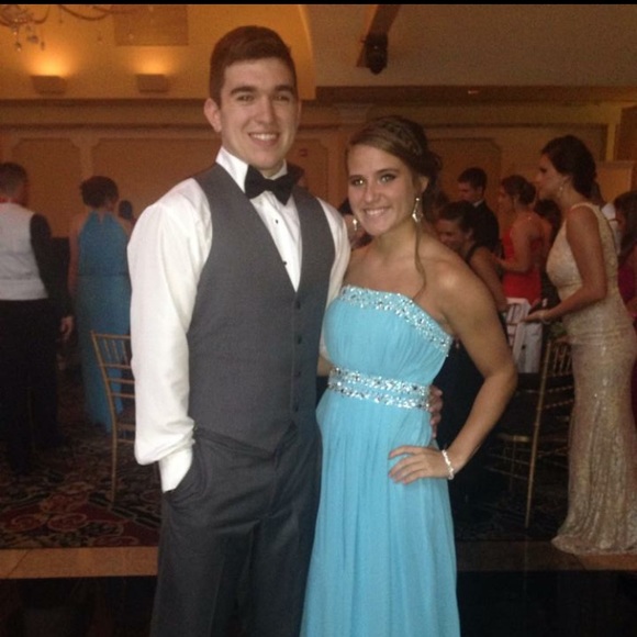 Baby blue prom dress...worn once to prom in 2014! Has been dry cleaned and hanging since then so it is still in great condition!! Size 4! Built in bra! I am only 5'2'' so they did alter the dress to be shorter! Offers are welcome!