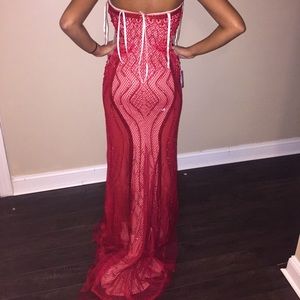 Size 4, never worn or altered, still has tags on it for $798. Bought from Henri’s Cloud 9. Hand beaded, shear on sides, red and nude.