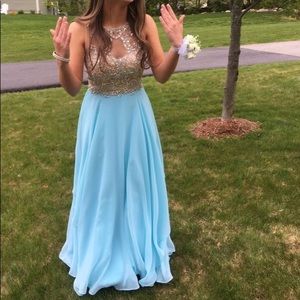 Pale blue, from amari in Burlington, only worn once, size 0, but I’m usually a 2 so it’s rather roomy. I am 5’3” and wore 3” heels and it came right to the ground.