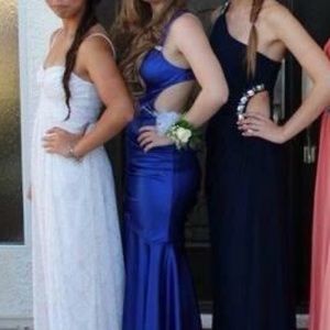 Blue mermaid style dress with crisscross straps to create an open back. Size 3/4. FIGURE FLATTERING. Hanging pictures don’t do it justice. Unaltered.