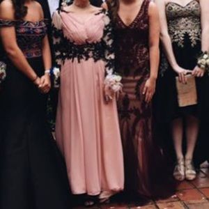 Light pink, mesh (clear/skin tone) with black lace sleeves, black lace lining waistline