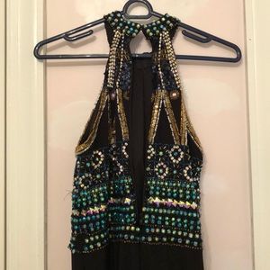 Stretchy material. Super comfy. Few beads are missing. Has some damage.