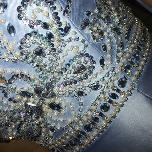 Light blue mermaid style prom dress with low neckline and beautiful silver, blue, and pearl beading. Has a low back and was only worn once. I’m 5’1 and ended up wearing the dress with converse after getting it hemmed for about 4 inch heels but it looks good either way. Has a few small stains but will get it cleaned before it’s shipped. Message me if you’re interested in the measurements!