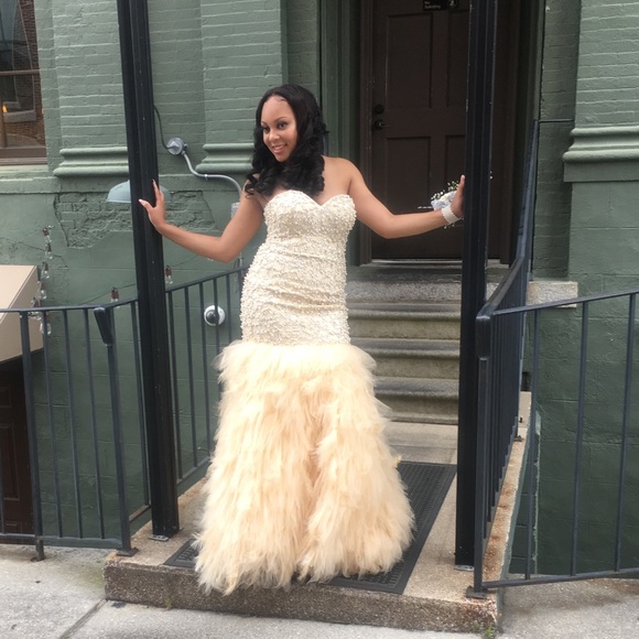 Ivory color with peals, and beading rhinestones. Feathered trained bottom