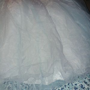 NextEve size 18 (fits like 14/16) from a u.k. website. Blue and grey dress with pearls, diamonds, and other jewls. Small stain from dancing on gym floor on the slip underneath. With all the tulle you cant see the stain. Photo 6 and 7. Last photo is me in the dress.