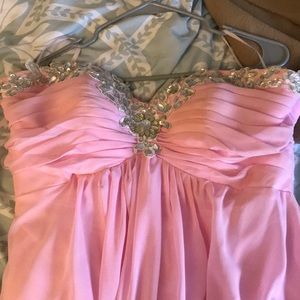 Pink floor length prom dress with bedazzled bodice. Very good condition, only worn once. Just needs to be dry cleaned and it will be good as new!