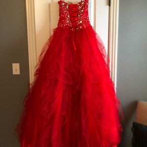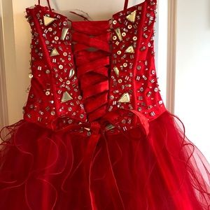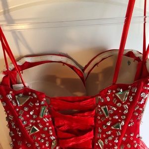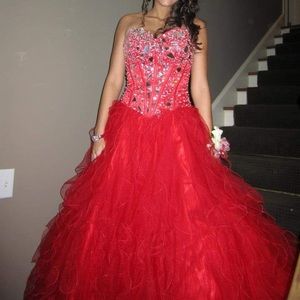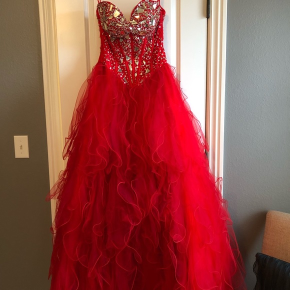 Beautiful red prom dress. Corset back makes it adjustable to a size 0-6. Silver embellishments. Only worn once. I’m 5’3 so it is altered to just barely touch the floor. Has B cups sewn into it. Purchased from a bridal store.