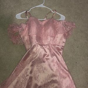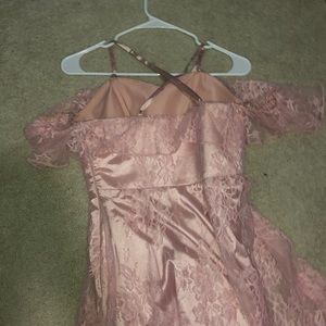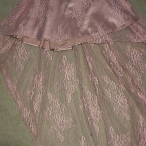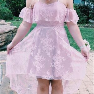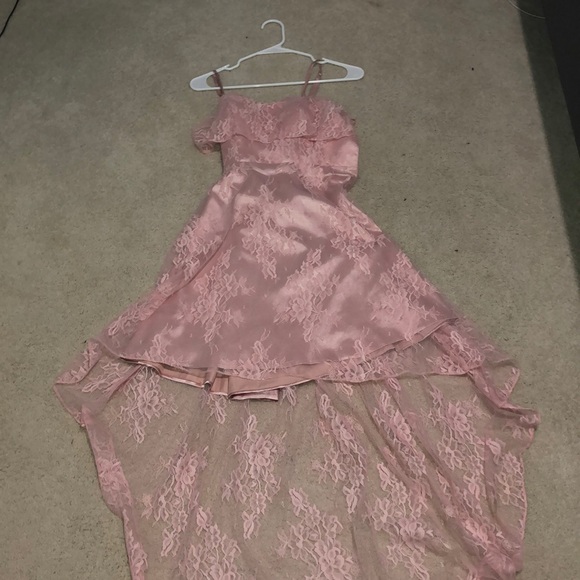 Light pink high-low prom dress. Not too bold or flashy yet still classy! I love the flower pattern on the dress and the straps are adjustable! Also the sleeves are a nice touch to compliment the shoulders!