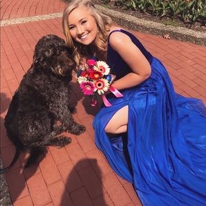 Royal blue prom dress!!! Such a comfortable and classy dress. The top is velvet and the slit was put in by a seamstress. Top fits like a 4. ONE WORN ONCE