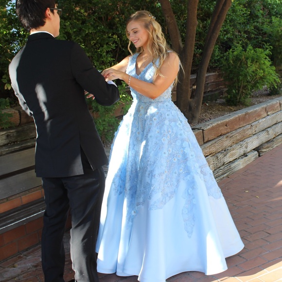 This dress made me feel like a princess! It has beautiful embellishments with 3D flowers. Altered to my height + 4 inch heels (I am 5’2). Very flattering & great quality!