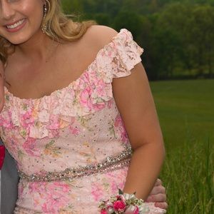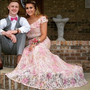 •Beautiful baby pink and floral lace dress with unique off the shoulder design!