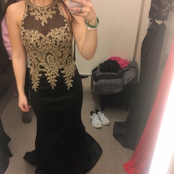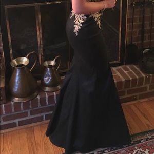 Black and gold prom dress worn once! Mermaid fit dress with gold detailing, size 2, altered to fit someone 5’0-5’2, small train added during alterations, originally purchased from Nordstrom. I look forward to hearing from you!