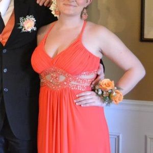 Coral prom dress. Stretchy fabric that’s super flattering. Cut outs with tan mesh around the rib cage. Braided straps.