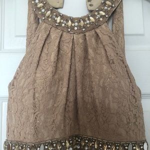 This dress is a beautiful tan / cream dress with rhinestones around the neck and below the breasts. Also has mesh on the sides.