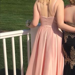 I wore this for my junior prom last year. It’s super comfortable, silky, and has pockets. It’s hemmed to fit 5’10”. There’s a small rip in the hem, but other than that there’s nothing wrong with it.