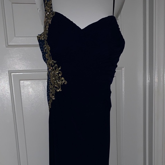 Size 12! The dress was only worn once and recently dry cleaned! It is a midnight blue dress and has one strap with sheer detailing on the side!