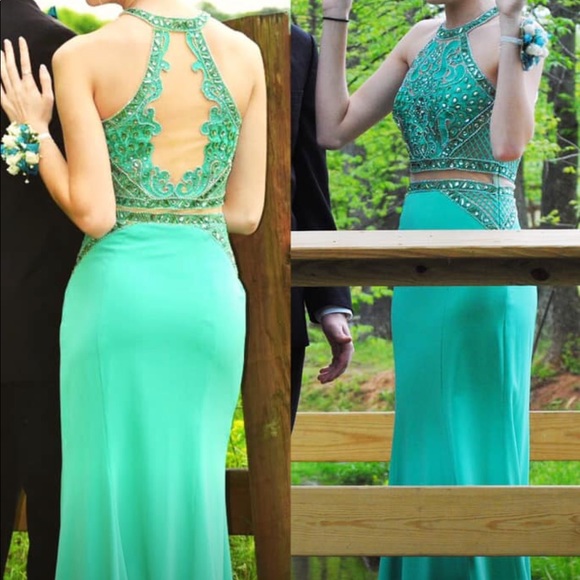 Beautiful sea foam green prom dress. Mock 2-piece. Sequined top with open back. Light-weight. A few alterations done to make shorter and a little tighter around waist. Model is 5’8” & 120lbs. Only worn once!