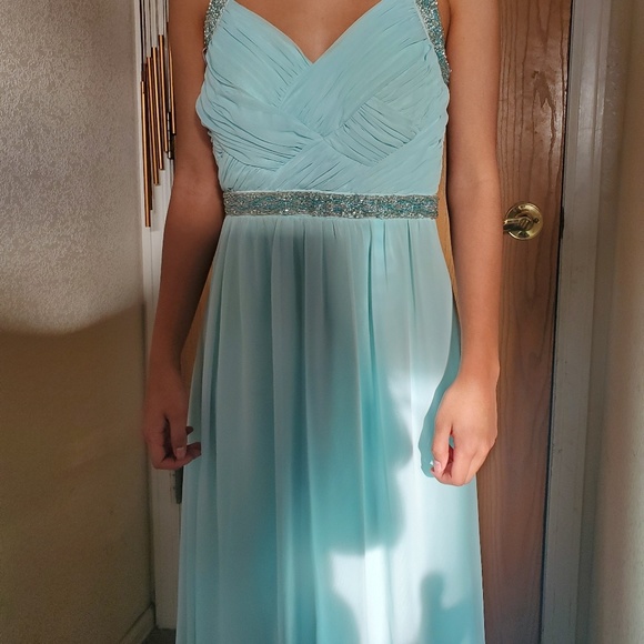 Light blue prom dress, worn twice. Has been hemmed slightly. Clasp/hook on the strap to adjust how much cleavage is shown.