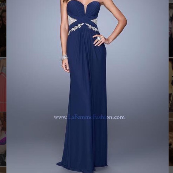 strapless navy blue prom dress with some see through lace that has some sparkles intertwined in it. Only worn once, alteration was made for it so if it’s big you can take it for alterations and you honestly can’t tell it was touched. I can send you the matching garter too that was never worn.
