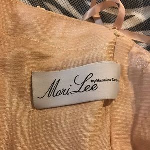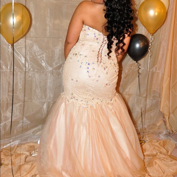 Champagne iridescent with rhinestones, fishtail, lace up back, Worn only once, Sold by Peaches Boutique in Chicago, kept in original garment bag from Peaches.