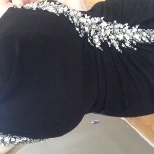 Floor length, sequin detail on waist and strap, off shoulder, very flattering to figure. Perfect for prom!