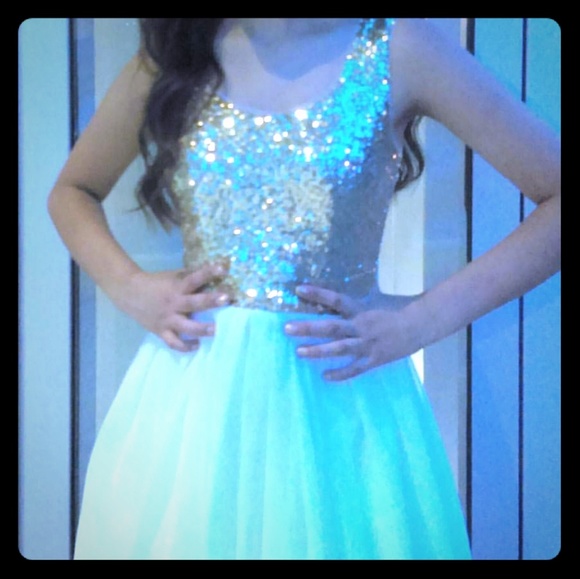 Gold sequence top with white skirt. I am 5'2 and weight 100 pounds. Bra size 32 B and waist size 23-24