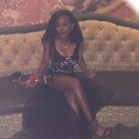 Sparkly beaded dress with lace detail and see-through tulle at the bottom half.