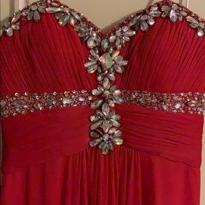 Purchased from Lord and Taylor, strapless, red color with jewels and beading, bottom flows and is not tight