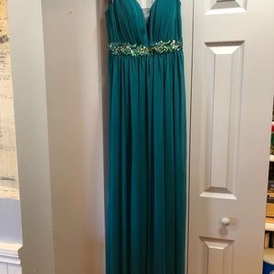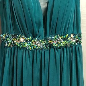 Emerald green long gown. Adjustable shoulder straps. Mesh covered v in front, beautiful beading. Worn once.