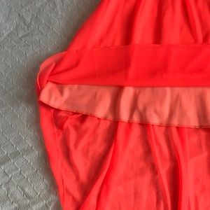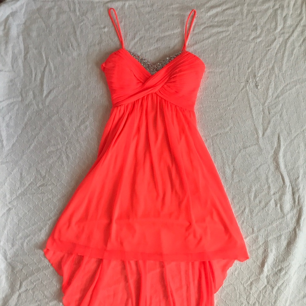 High-low neon orange prom dress with jewels on chest. Only worn once! Perfect for prom season and has zipper that goes midway down the back.