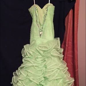 Lime green prom dress worn twice. Asymmetrical waist Is a size 2 could adjust to fit a 0-4 possibly 6 since it is a corset back