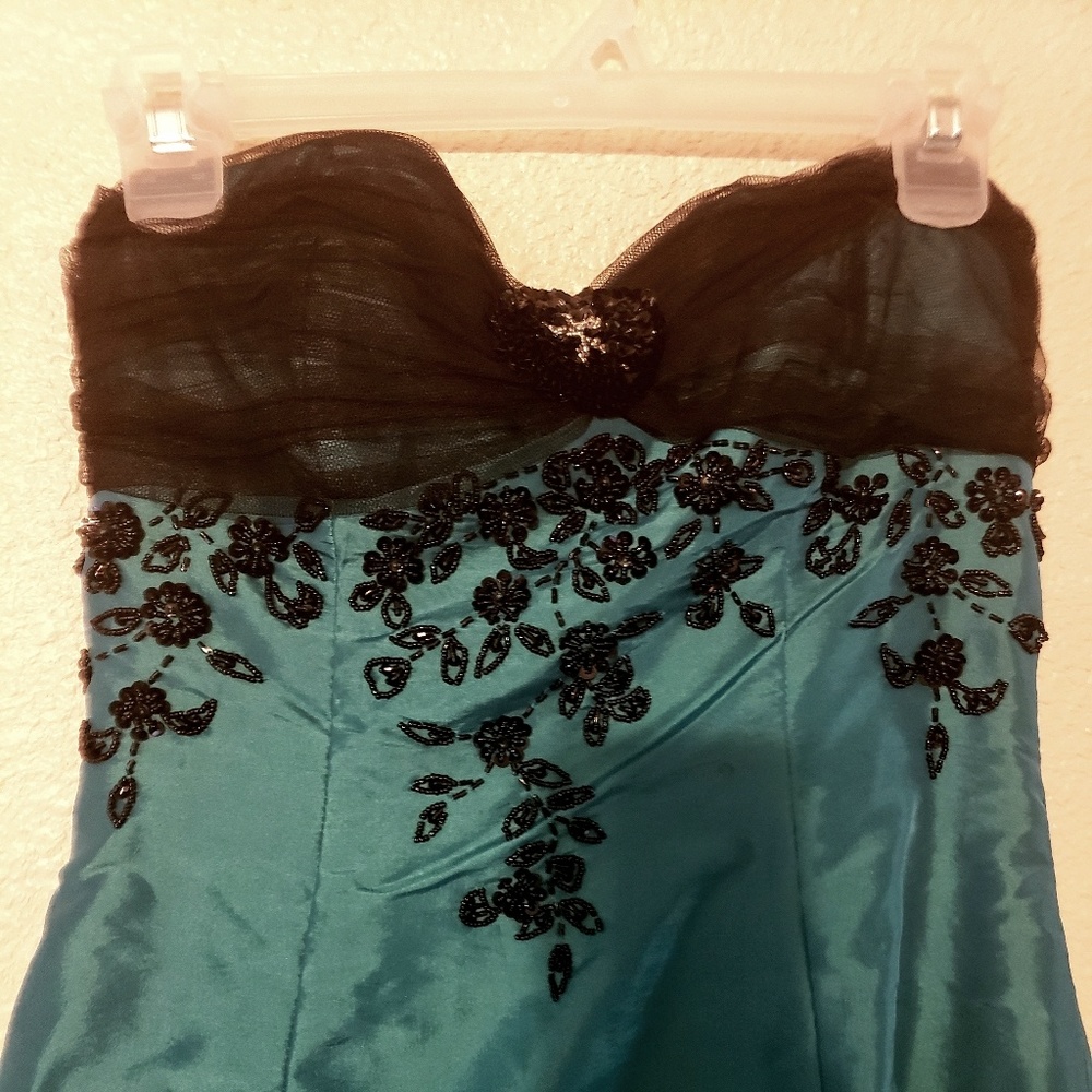 Teal prom dress with beautiful black tulle and detailed beading. Can be worn strapless or can use spaghetti straps for more support. Worn once for prom.