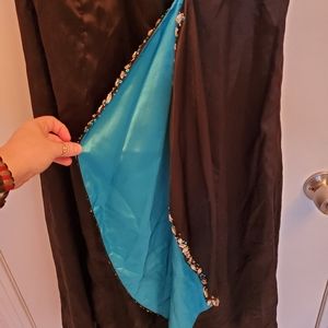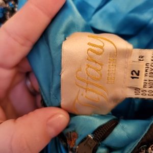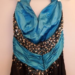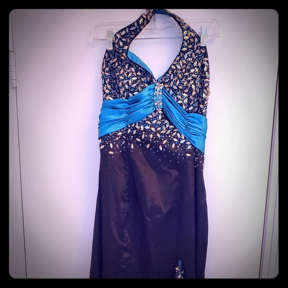 Beautiful black and blue prom dress, still in great condition. Halter top, with slit up left side up to just above knee depending on individual height.