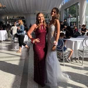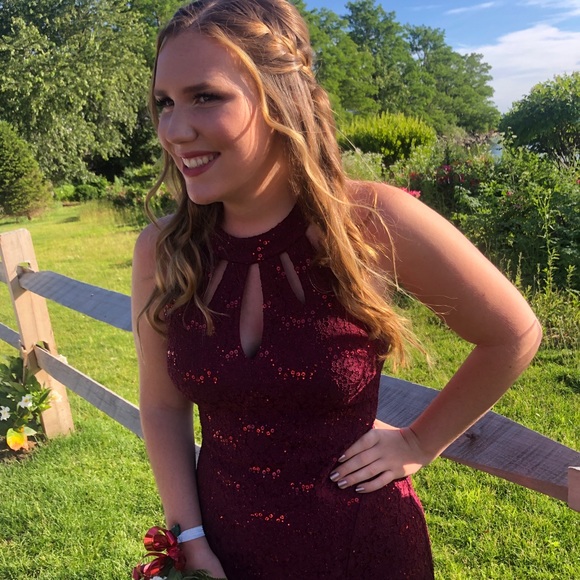 Maroon colored sparkly prom dress. Very good quality, only worn once and no alternations made