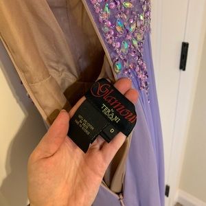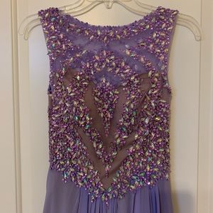 Beautiful beaded and flowy prom dress. Fitted in top them it flows out with a slit on the leg. Small hole in the back but not noticeable with how the fabric lays. Light weight fabric and beautiful in photos.
