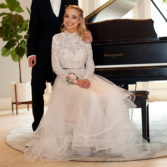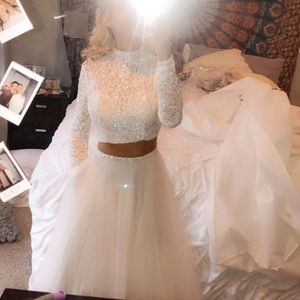 Super cute long sleeve prom dress. A size 2 and only worn once for a couple of hours! very comfortable and easy to move around in. the back is open and has been altered down to fit a 5’4 with vans on NOT heals! It is more of an off white than a bright white and not quite a cream