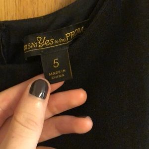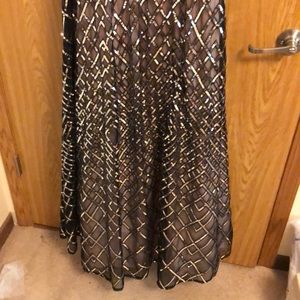 Black long prom dress with peach underneath and a silver sequined pattern. Mid section is see through. Padded