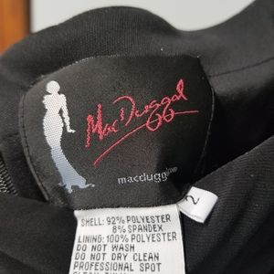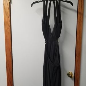 Stretchy polyester fabric with jewelled center, open back, sleeveless, small train, knee high slit on side, fit tall women well