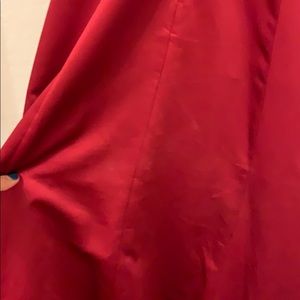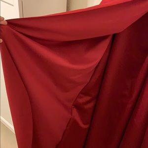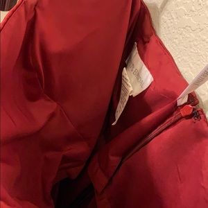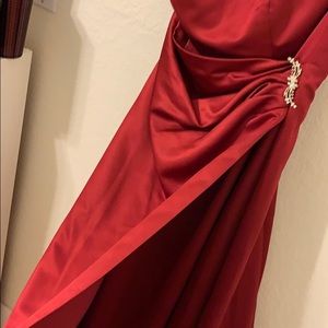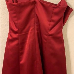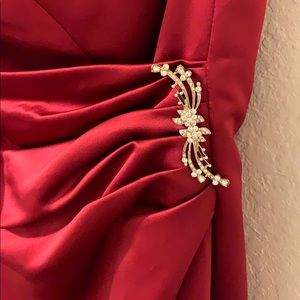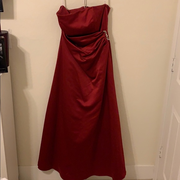 Deep red strapless prom dress, slight puff towards the bottom with a back zipper and broche side. Wiring over breast over but no pad inserts. Slight ware in the behind.