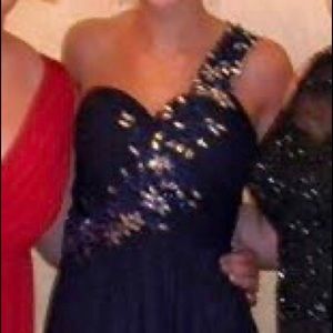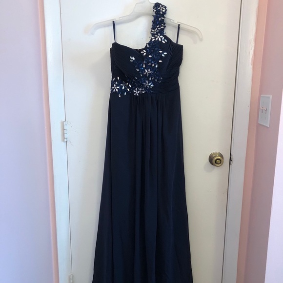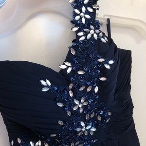 Navy blue, floor-length gown. Empire waist, sweetheart neckline, over-the-left-shoulder strap. Intricate embroidery & ruched bodice. Size 0-2. Worn twice, in like-new condition. Price negotiable!