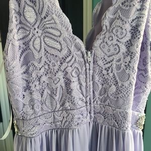 Lilac halter prom dress with asymmetrical bottom. It has a floral lace like design on the front and back and a beaded waist. In great condition except for a loose string which is pictured. It's a jrs size 1 but fits like 0