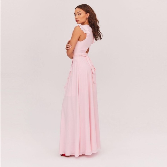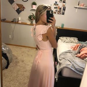 This is a brand new prom dress that I just ordered! I absolutely LOVE this dress however ordered 2 other ones and won’t be keeping this dress. It is from Fame and Partners and originally 290$. It is light pink and has an adjustable wrap on it. Never been worn. Size 4 but is very adjustable.