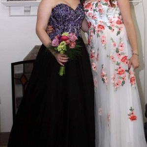 Strapless, floorlength ball gown. Purple and silver detail and black skirt.