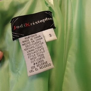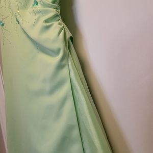 green dress with blue accent flowers. has straps sewn in that could be removed easily. needs a little stitching in one spot in the back and two little marks that could come out with a good dry cleaning.