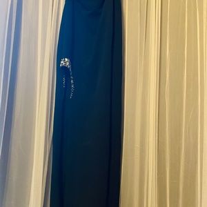 Strapless black dress with high slit. Silver gemstones on top of slit. Size 8. Length fits well for 5’3” with high heels. David’s Bridal.