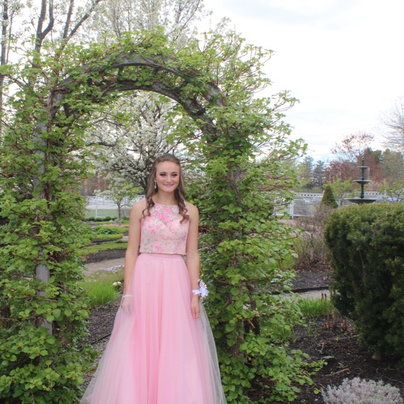 Beautiful pink floral two-piece prom dress. Size 2 but the bottom fits more like a 0. Only worn once and in link-new condition no stains or other blemishes. This style is no longer being made but it was originally $500 and you can find it in boutiques now for around $300.