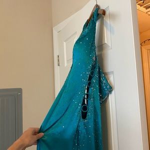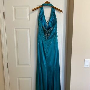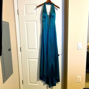 Teal Prom Dress size small. Around the neck holster. Silk with beaded design in front and bottom back area. Sides are open with a slit in the front