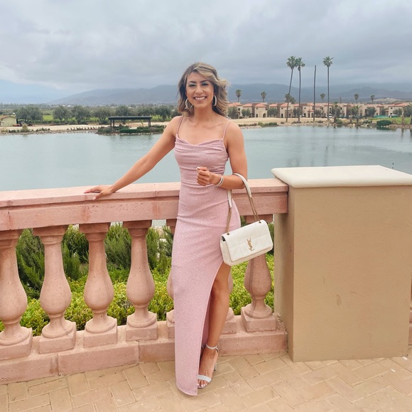 Beautiful dress I wore to my cousins wedding! It is a light mauve color & full of sparkle & glitter 😍. Non see through. The dress has been dry cleaned.